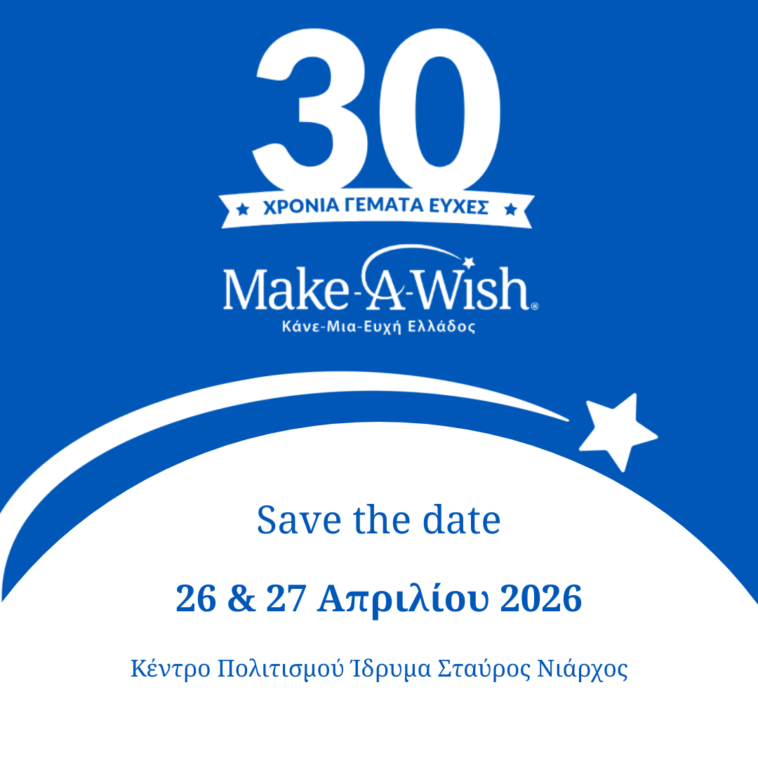 Το 2026 σηματοδοτεί την επετειακή χρονιά των 30 χρόνων του Make-A-Wish Ελλάδος, μια χρονιά γιορτής και αναστοχασμού για όσα καταφέραμε μαζί με εθελοντές, δωρητές και υποστηρικτές. Η κορύφωση θα γίνει με ένα εορταστικό διήμερο στο Κέντρο Πολιτισμού Ίδρυμα Σταύρος Νιάρχος στις 26 και 27 Απριλίου 2026  μια γιορτή για τα παιδιά, τις ευχές τους και όλους όσους στάθηκαν δίπλα τους.