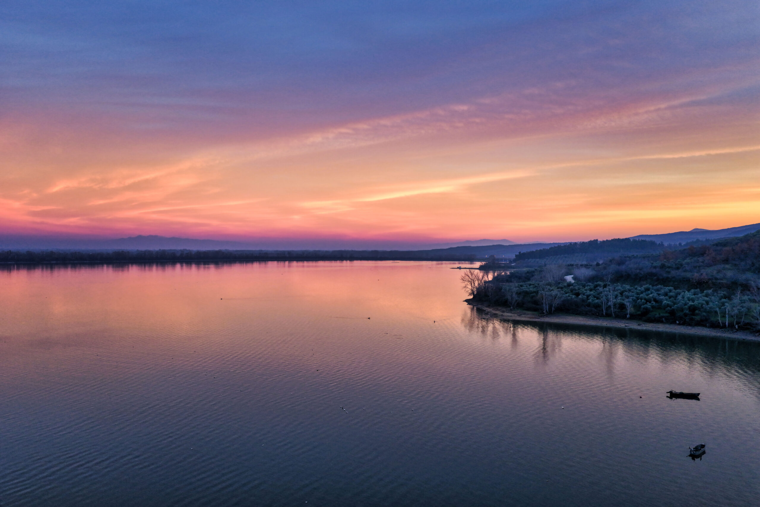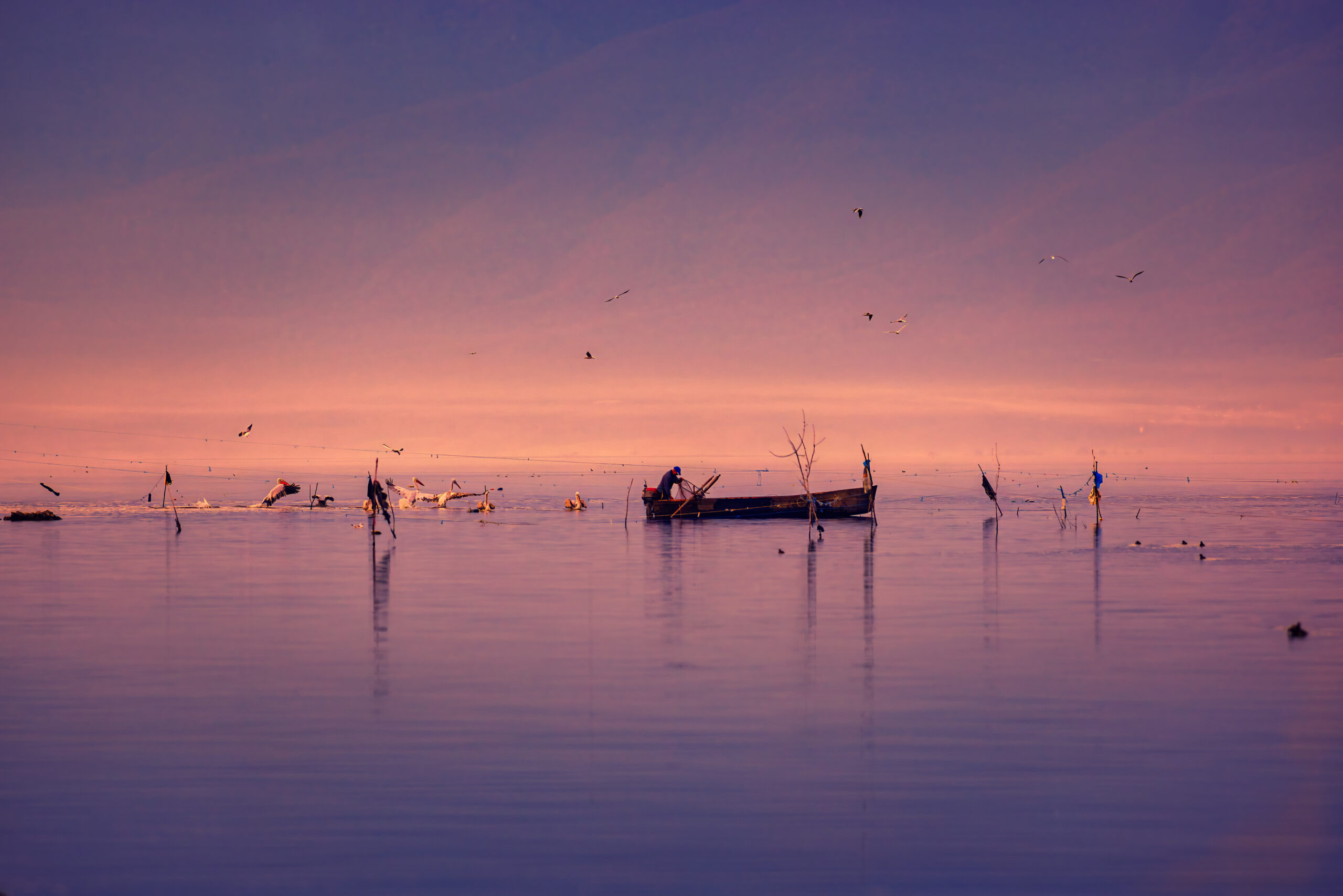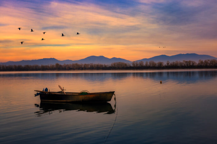 Η λίμνη Κερκίνη στο ηλιοβασίλεμα αποκαλύπτει το πιο γαλήνιο και αυθεντικό της πρόσωπο. Το απαλό, χρυσαφένιο φως απλώνεται πάνω στο νερό, δημιουργώντας ήσυχες αντανακλάσεις, ενώ οι πελεκάνοι κινούνται χαμηλά, σχεδόν τελετουργικά. Οι βάρκες, ακίνητες ή σε αργή πορεία, ολοκληρώνουν το χαρακτηριστικό τοπίο του υγροτόπου, όπου ο χρόνος μοιάζει να επιβραδύνει.