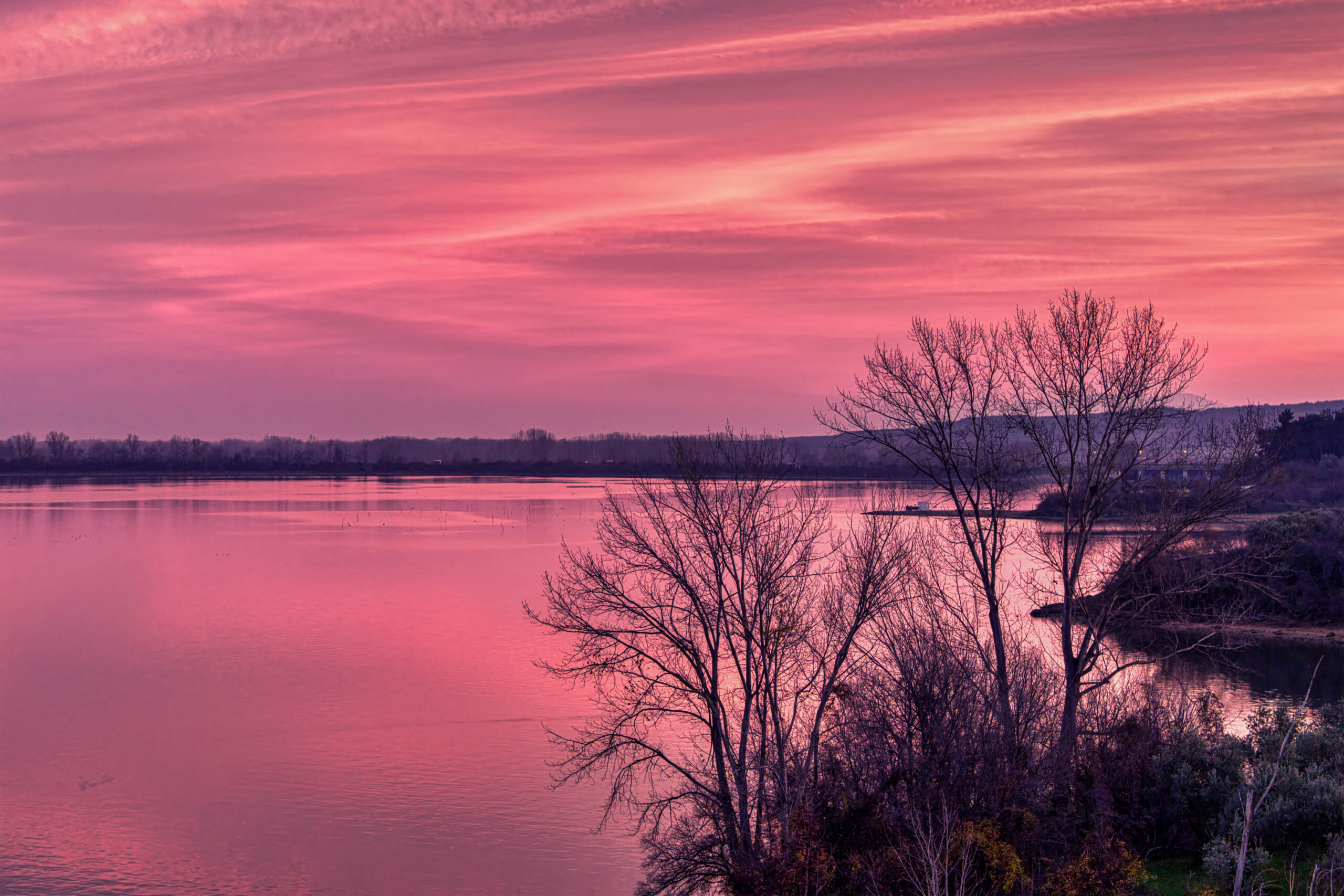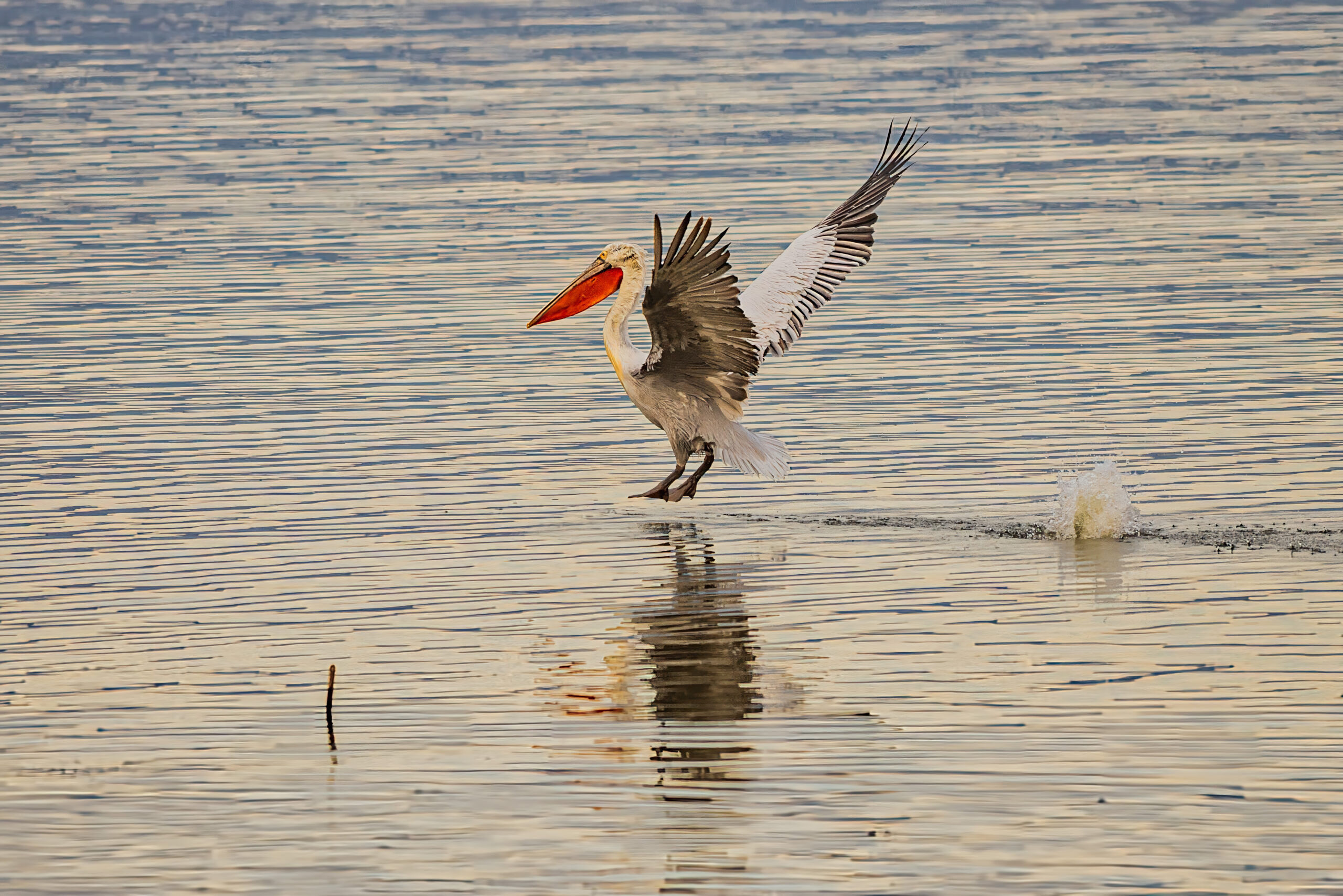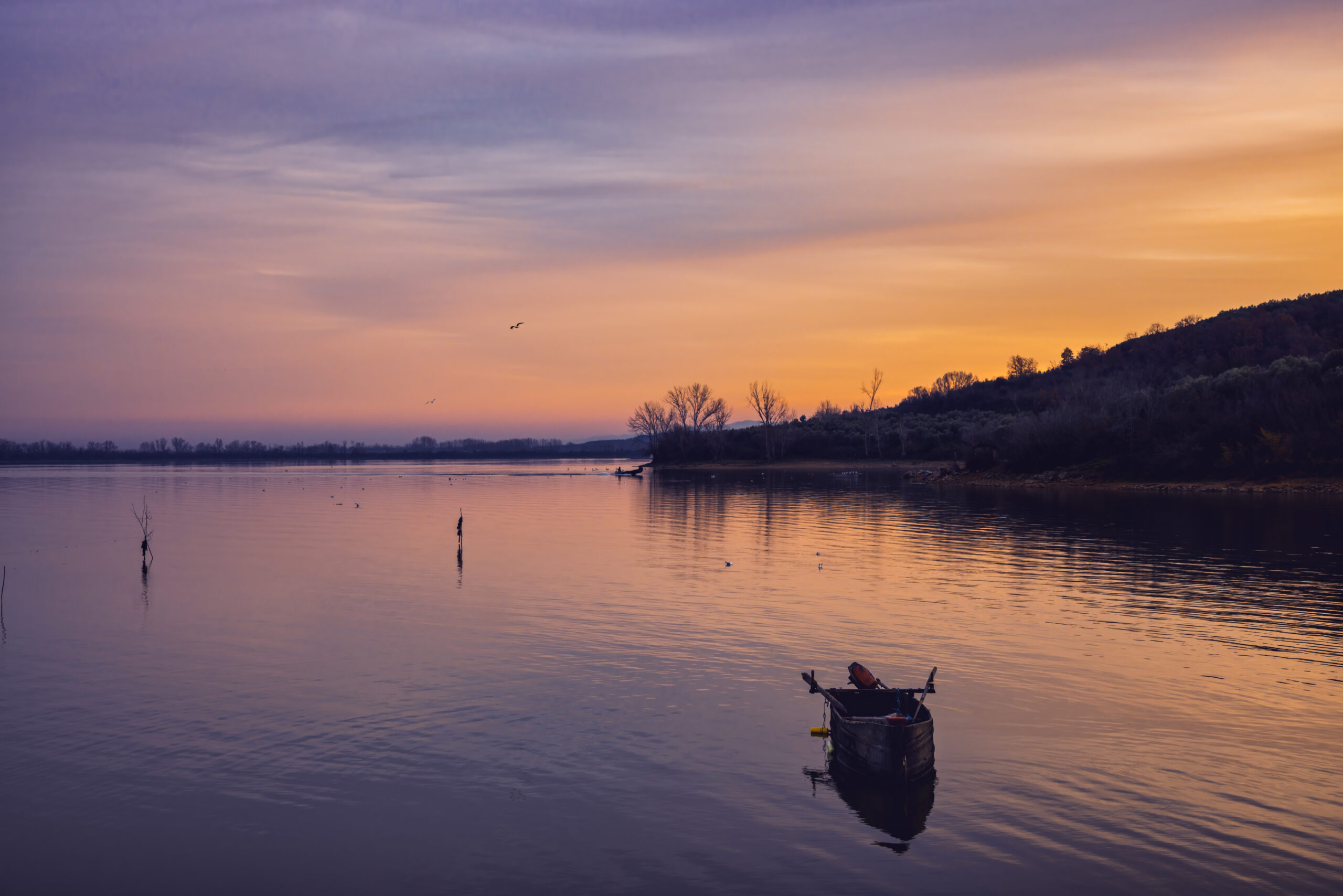 Η λίμνη Κερκίνη στο ηλιοβασίλεμα αποκαλύπτει το πιο γαλήνιο και αυθεντικό της πρόσωπο. Το απαλό, χρυσαφένιο φως απλώνεται πάνω στο νερό, δημιουργώντας ήσυχες αντανακλάσεις, ενώ οι πελεκάνοι κινούνται χαμηλά, σχεδόν τελετουργικά. Οι βάρκες, ακίνητες ή σε αργή πορεία, ολοκληρώνουν το χαρακτηριστικό τοπίο του υγροτόπου, όπου ο χρόνος μοιάζει να επιβραδύνει.