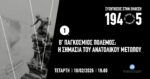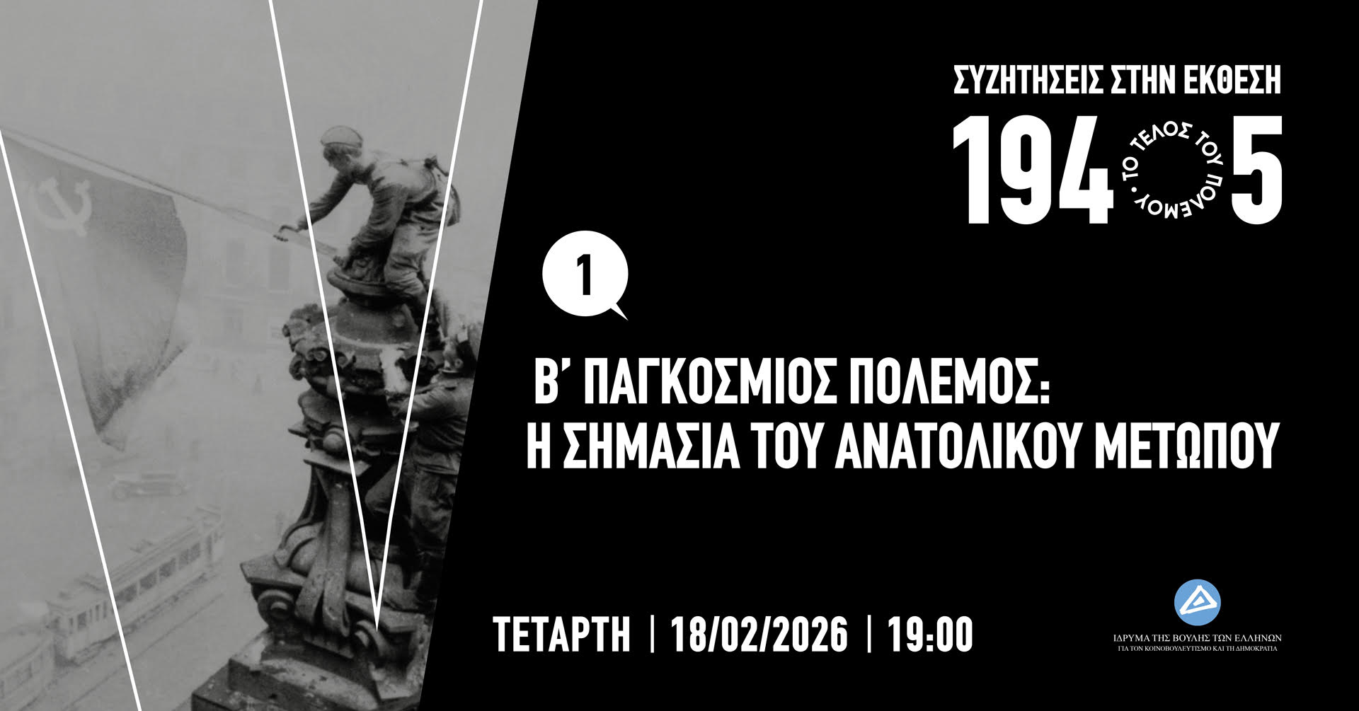 Το Ίδρυμα της Βουλής των Ελλήνων για τον Κοινοβουλευτισμό και τη Δημοκρατία, στο πλαίσιο της έκθεσης «1945: Το τέλος του πολέμου», συνεχίζει τον κύκλο εκδηλώσεων με τίτλο «Συζητήσεις στην έκθεση», ο οποίος θα πραγματοποιείται μία Τετάρτη κάθε μήνα. Στόχος της πρωτοβουλίας είναι η εμβάθυνση στις καθοριστικές τομές του 1945, μιας χρονιάς-ορόσημο που σηματοδότησε το τέλος του Β΄ Παγκοσμίου Πολέμου και την απαρχή μιας νέας εποχής για την ανθρωπότητα.